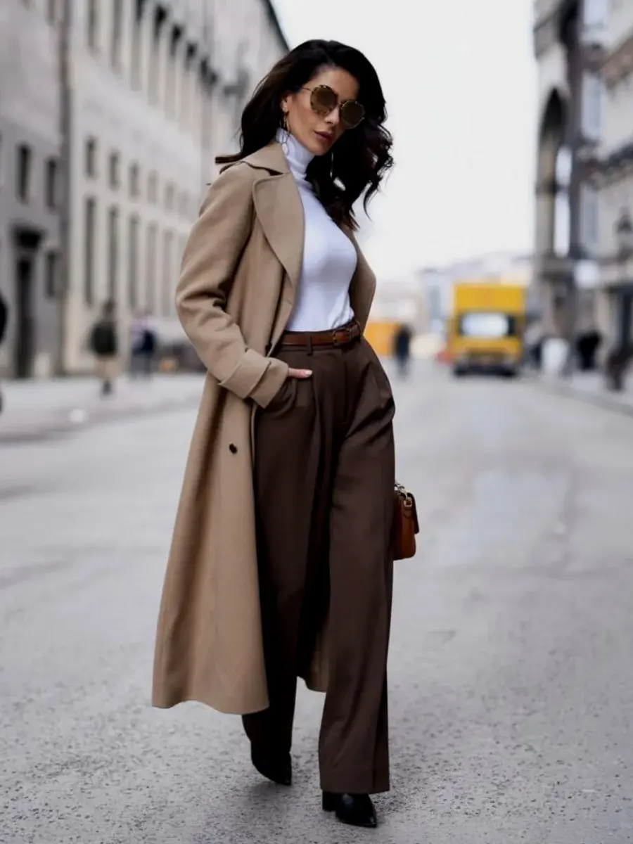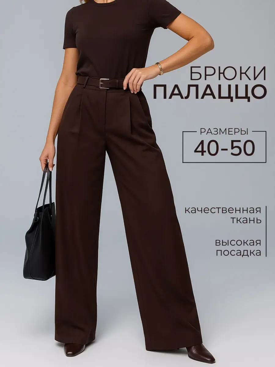 Праздничные строгие штаны представлены в универсальном коричневом цвете, который легко комбинируется с разной одеждой и аксессуарами. Для больших размеров, для худых девушек и моделей для подростков — широкие брюки палаццо с высокой посадкой станут отличным выбором, подчеркнув индивидуальный стиль и обеспечив комфорт в течение всего дня. Длинные широкие брюки идеально подходят для создания как строгих офисных образов, так и праздничных комплектов, благодаря своему универсальному дизайну и классической форме.