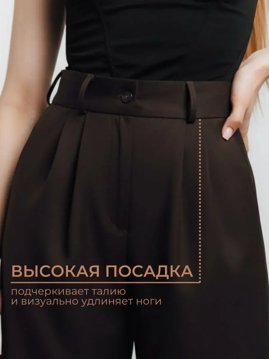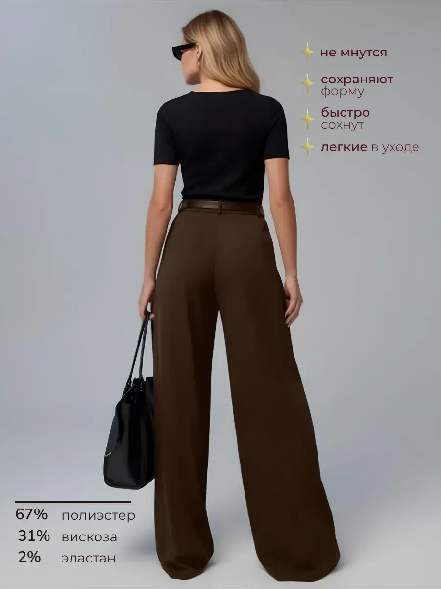 Стильные женские брюки палаццо классические с высокой посадкой — идеальный выбор для женщин, ценящих комфорт и элегантность. Эти широкие костюмные штаны выполнены из струящихся тканей, таких как вискоза, полиэстр, эластан и подходят для любого сезона — весна, лето, осень, зима. демисезон. Коричневые брюки с защипами и высокой талией подчеркивает женственность и создает стройный силуэт, идеально садится на рост 158, 164 и 170 см, а также для девушек с разной фигурой — как для худых, так и для полных (большие размеры).